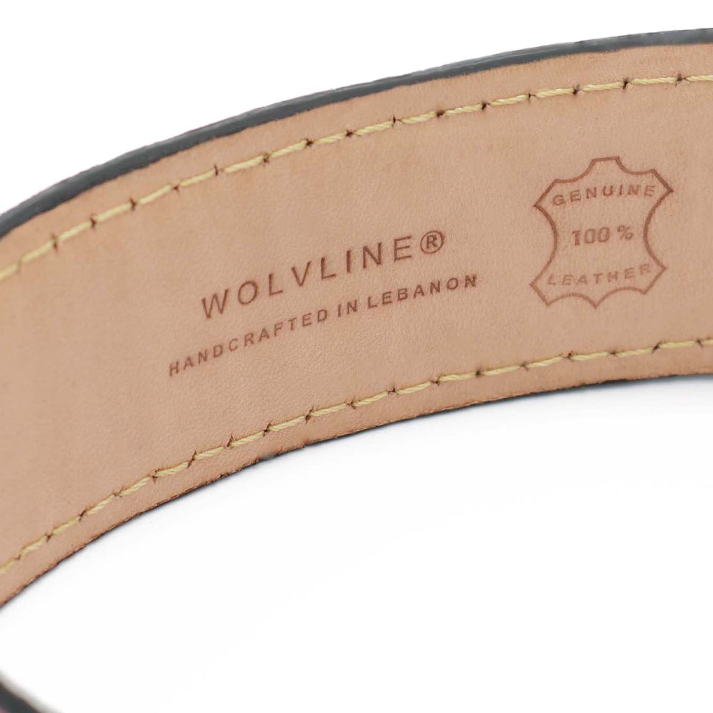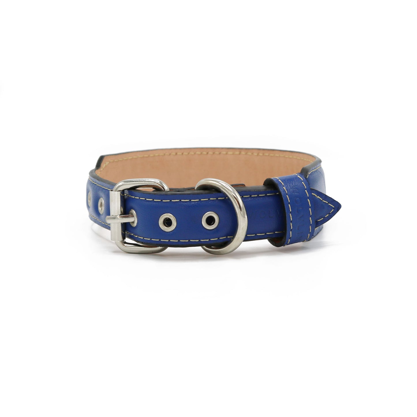 Wolvline Blue leather dog collar with a white logo on a white background